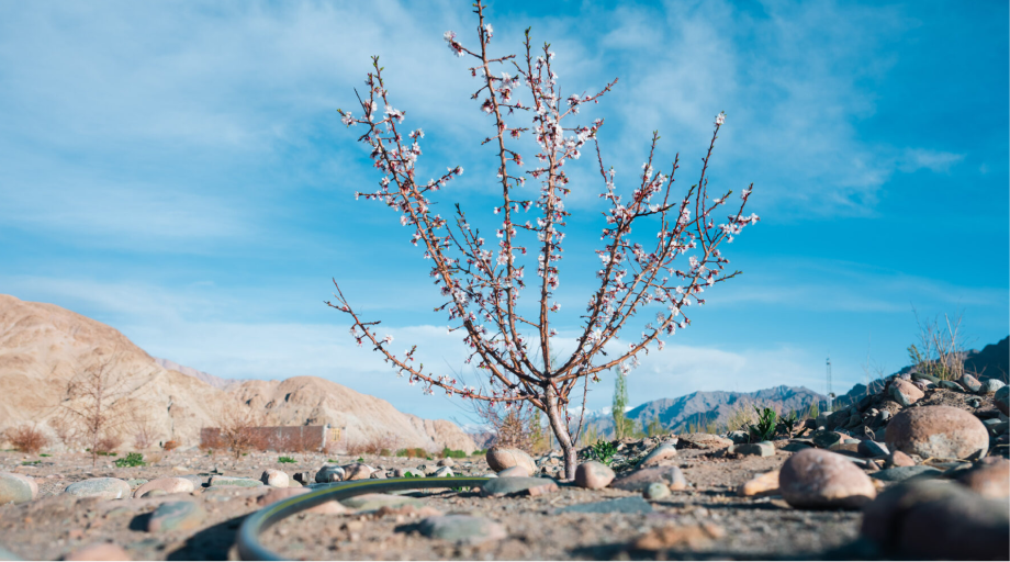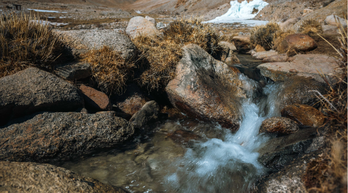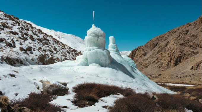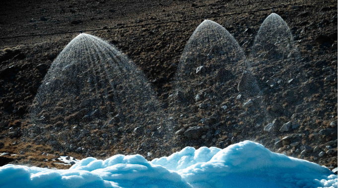 Pipelines redirect glacial/spring water to hanging fountain pipelines using only gravity.